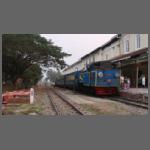 - Bild 2102-003 zeigt die Einfahrt eines Fernzuges mit 15 km/h in Madurai, er besteht aus den moderneren, eckigen Wagen, die in verschiedenen Farben gehalten sind