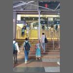 An unserem Ziel beginnt gleichzeitig eine "Metro". Diese autarke Linie ist rund 11 Kilometer lang und komplett aufgeständert. Gebaut von DB International, ist sie in Normalspur ausgeführt, die Triebwagen stammen von Alstom. Die Züge sind klimatisiert und auch die Türen waren zu! Und weil die Züge voll waren, war von draußen nur wenig mitzubekommen. Ein Foto der Züge war nicht gescheit umsetzbar. Interessanterweise gab es an dem einen Endpunkt eine Treppe die Männlein und Weiblein getrennt hochlaufen sollten (Bild 1202-029). Aber soweit gesehen hat sich niemand dran gehalten. Oben mussten sich dann ohnehin alle einer Sicherheitskontrolle mit Durchleuchtung des Gepäcks unterziehen. Beim Nahverkehr in Mumbai hat man sich ein wenig verzettelt. Zusätzlich zum Metro-System, das auch weit hinter den Ambitionen zurückgeblieben ist, hat man eine Monorail-Bahn gebaut, mit der wir ebenfalls fahren wollten. Allerdings gab es im August 2025 eine Entgleisung (?!). Seitdem ruht der Betrieb und der Programmpunkt musste entfallen.