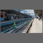 Gleich nebenan, am Breitspurbahnhof war gerade kein Zug zu erwarten. Der am Morgen aus Chennai gekommene Nachtzug "Nilgiri SF Express" (Bild 1802-002) würde erst nach 21 Uhr zurückfahren. Bis dahin hatte man also Zeit eine Weiche herauszureißen. Vielleicht auch zwei, das war nicht ganz klar (Bild 1802-003).
