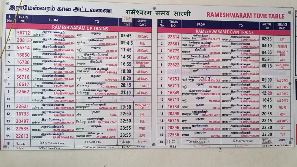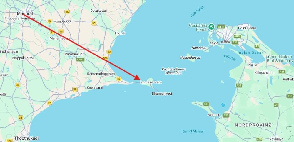 Rameswaram liegt auf der Insel Pamban. Diese Insel wird mit einer rund 2,5 km langen Brücke erreicht, die 2024 durch einen daneben liegenden Neubau ersetzt wurde. Laut openrailwaymap.org ist die Strecke noch nicht elektrifiziert, aber da ist das Portal nicht aktuell. Mittlerweile wird elektrisch gefahren.