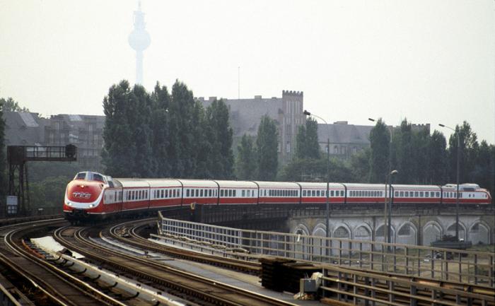 der erste IC 130 "MAX LIEBERMANN" auf der Berliner Stadtbahn, Humboldhafenbrücke vor dem Lehrter Stadtbahnhof, 01. August 1990