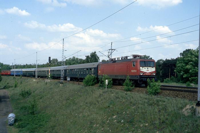 112 017 vor dem D 303 "NEPTUN" auf dem Berliner Außenring in Berlin-Wuhlheide, 14. Mai 1993
