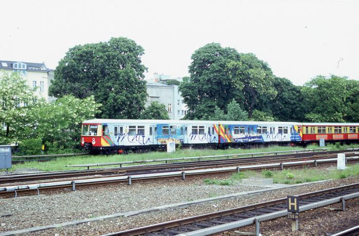 S-Bahn-Zug mit Werbung in Berlin-Charlottenburg, 01. Juni 1997