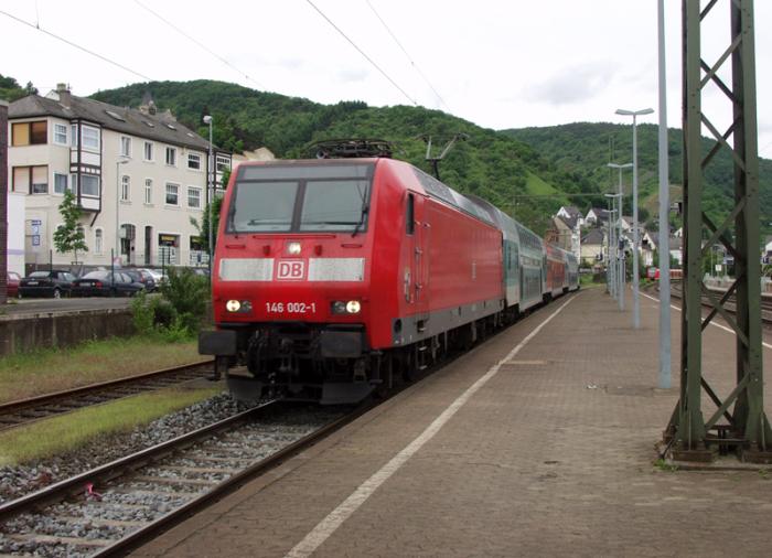 146 002 vor einem Regionalexpress in Boppard, 24. Mai 2002