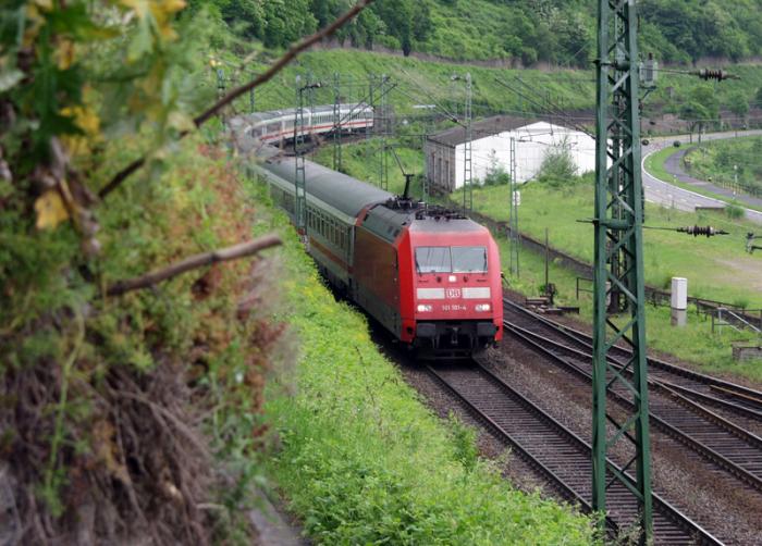 101 101 vor dem IC 602 "KAISERSTUHL" bei Kaub, 25. Mai 2002